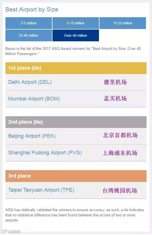 关于世界最佳机场,不同机构评出的榜单大不相同。之前2018年3月6日,国际机场协会(Airports Council International, ACI)公布2017年机场服务品质调查(Airport Service Quality, ASQ)结果,评选出全球最佳机场各个奖项,印度、中国多家机场榜上有名,排名位居前列。其中4000万级以上机场中,印度孟买机场、德里机场并列第一,中国北京首都机场、上海浦东机场则并列第二,台湾地区桃园机场排名第三,而新加坡樟宜机场、韩国仁川机场(未参与)、香港国际机场等多个榜单上的最佳机场并未进入该榜。