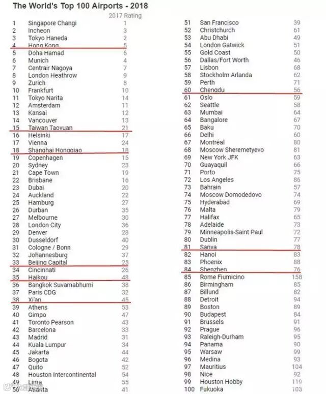 前100强中,中国(包括港澳台)共有9家机场上榜,其中内地7家。香港国际机场排名第4(2017年排名第5),台湾桃园国际机场排名15(2017年排名21),上海虹桥国际机场排名18(2017年也是排名18),北京首都国际机场排名33(2017年排名25),海口美兰国际机场排名35(2017年排名48),西安咸阳国际机场排名38(2017年排名45),成都双流国际机场排名60(2017年排名56),三亚凤凰国际机场排名81(2017年排名78),深圳宝安国际机场排名84(2017年排名78)。而中国内地三大枢纽中的上海浦东国际机场、广州白云国际机场未能上榜。