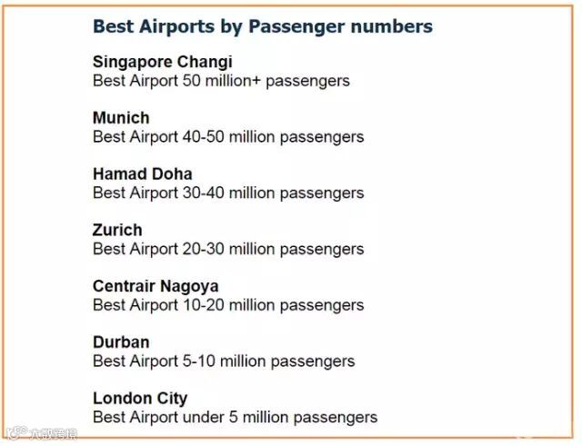 而根据吞吐量来分,新加坡樟宜国际机场为5000万级以上最佳机场,德国慕尼黑国际机场为4000万至5000万级最佳机场,卡塔尔多哈哈马德国际机场为3000万至4000万级最佳机场,瑞士苏黎世国际机场为2000万至3000万级最佳机场,日本名古屋中部国际机场为1000万至2000万级最佳机场,南非德班国际机场为500万至1000万级最佳机场,英国伦敦城市机场为500万级以下最佳机场。