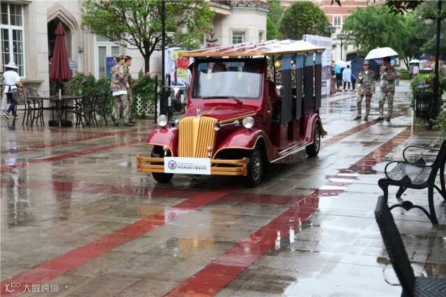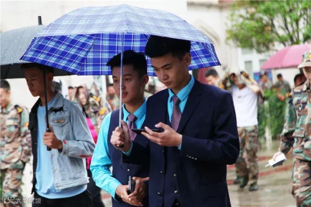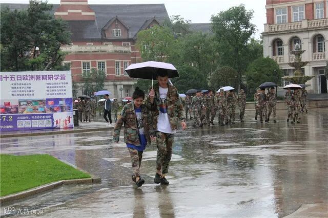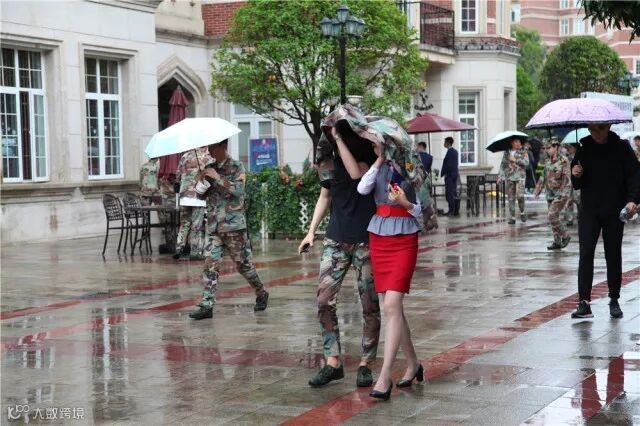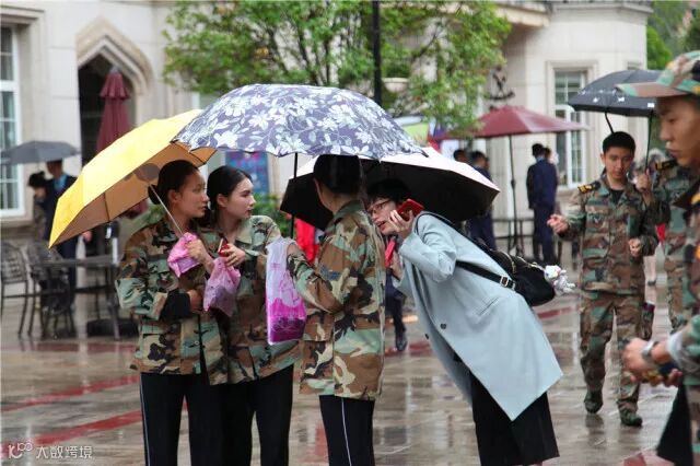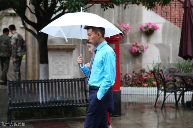 顺着伞,雨从稠密的质地上滚落到湿润的小径