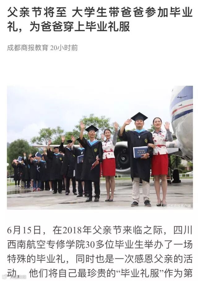 父亲节来临, 四川西南航空专修学院30多位毕业年级学生自发向学院申请,为自己提前举办了一场毕业典礼作为送给父亲的节日礼物。现场温馨感人,引起各大媒体关注。