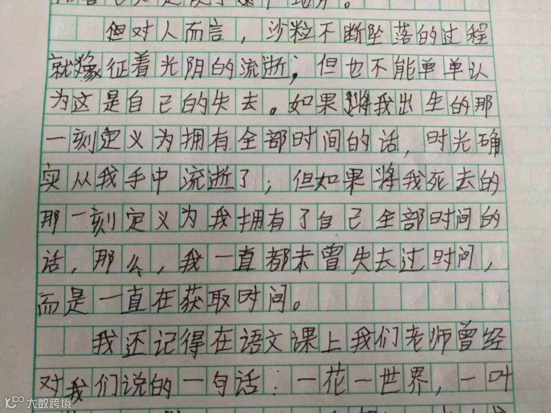 之前老师布置周记,主题自定,他起的题目是《沙漏》。文章主要是讲,他在观察沙漏流逝的过程中,思考时间的意义。