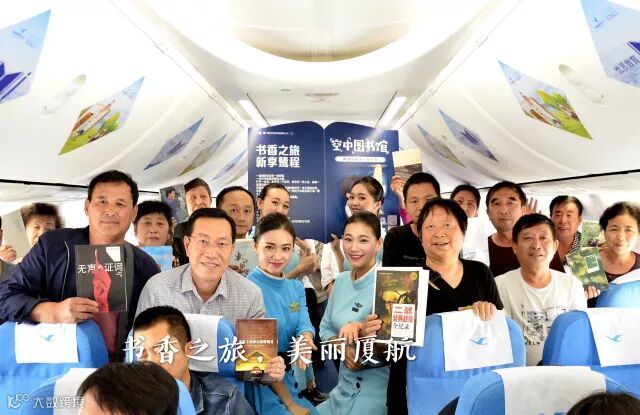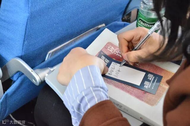 窗外是蓝天白云,客舱内一片淡然书香,旅客们手捧书籍,阅读着书签上的寄语,低头执笔思忖片刻,在书签的另一面留下此时的心境,这仿佛是一场跨越时空的对话,缘起书籍,对话的两头是两颗赤诚饱满的心。