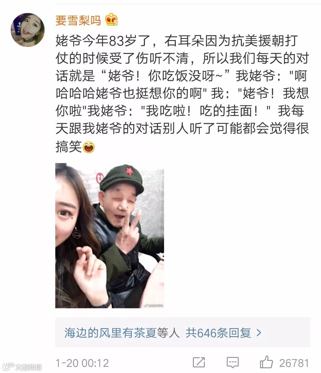 @苏大妍: 同爷爷抗美援朝军人。今年去世十年了,爸爸也是军人,姑父是两参军人,看到英雄们的后代总是感觉很亲切。