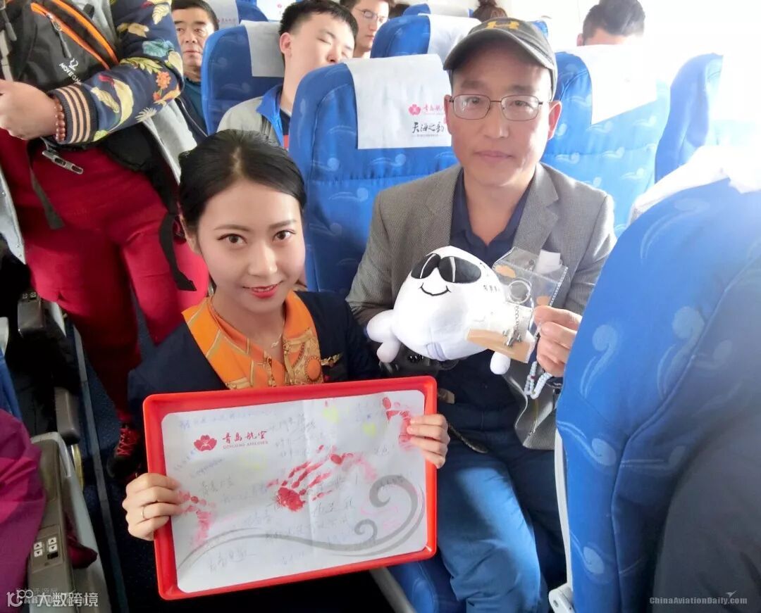 随着音乐响起,主持人进行广播,赞颂一代又一代的青年导师学成归来,为了国家的富强,奉献青春,付出劳动与智慧。期间,乘务员收集了旅客写下的明信片,一个抽奖箱里,一张张都是旅客写下的梦想。为了突出“为青春点赞”主题,空乘们还将旅客的大拇指印、孩子的手掌印都印制在画板上,共同为梦想、为青春点赞,现场气氛异常活跃。欢声笑语中旅客们纷纷表达了对活动的喜爱并表示会再次乘坐青岛航空。