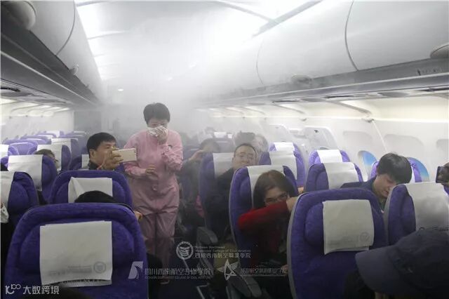 伴随着火光,一阵阵烟雾从飞机内的行李架中飘出,很快便充满了整个客舱。面对此情此景,“乘客”们显得十分新奇,纷纷拿出手机进行拍摄。
