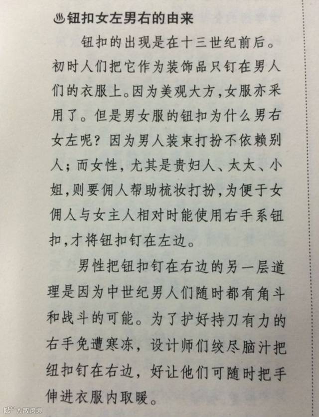 男女衬衫扣子方向不一样。