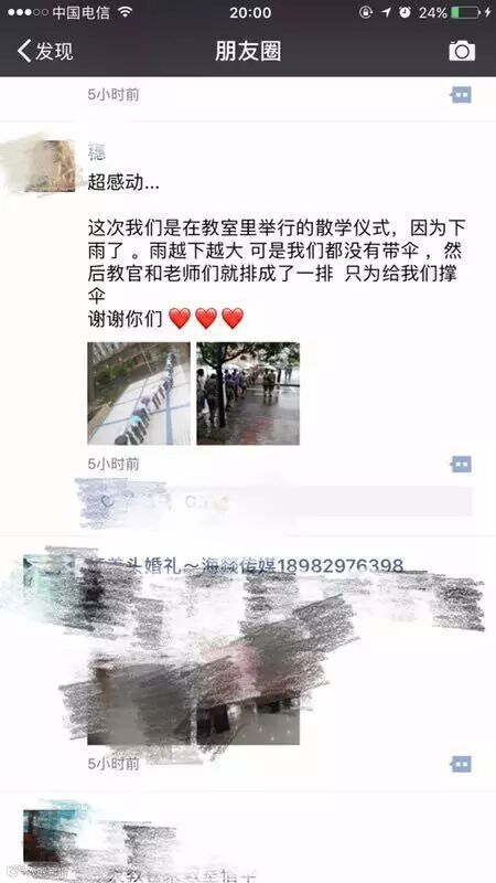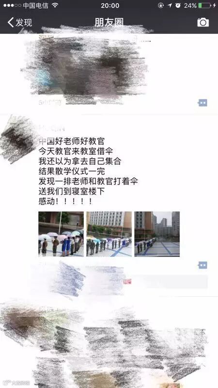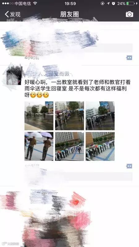 对突然出现在校园中的暖心举动,同学们非常感动。该校空中乘务专业的岳柳杰说:“一出教室就看到老师和教官打着雨伞护送学生回寝室,真的被感动到了,谢谢你们!”