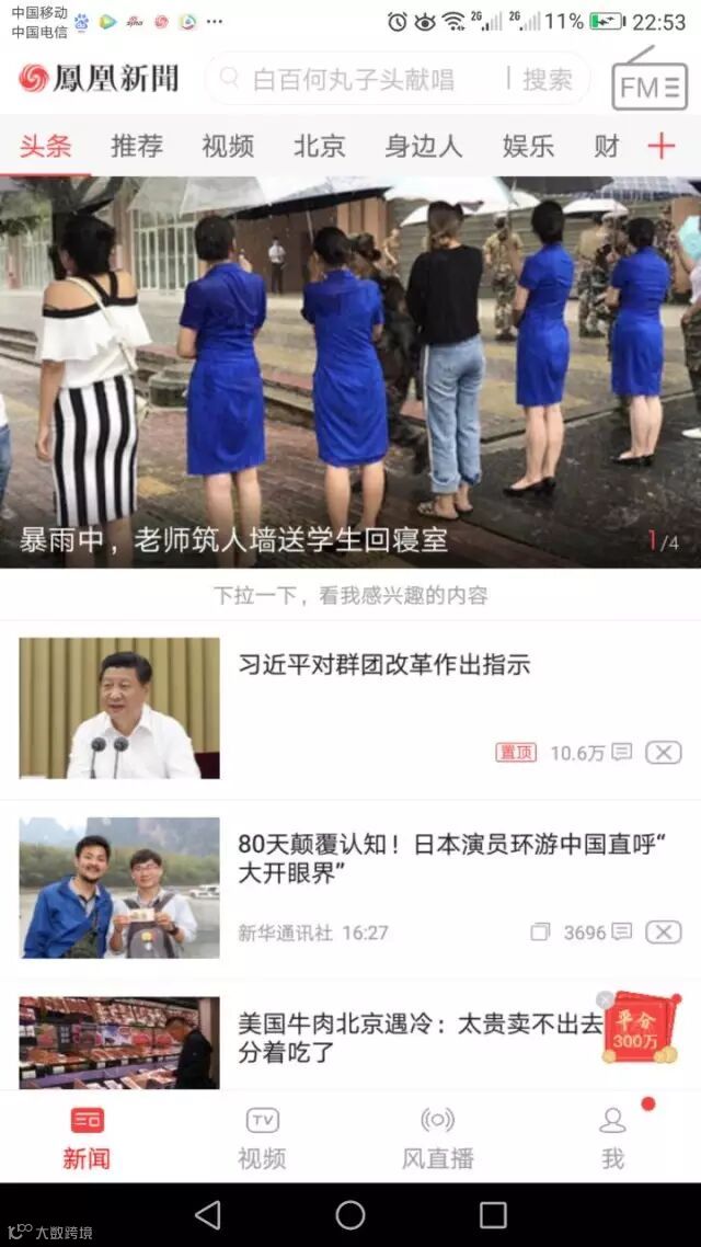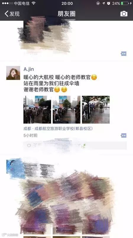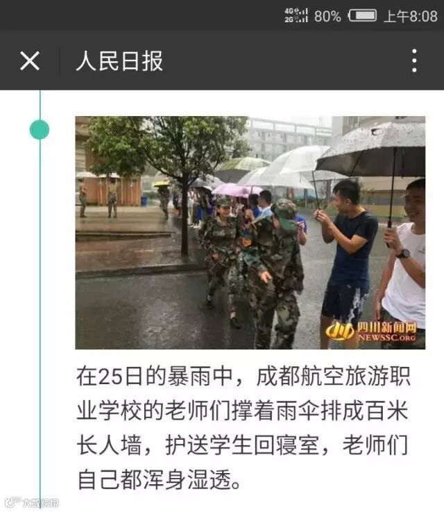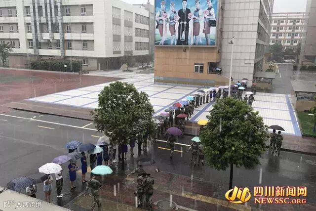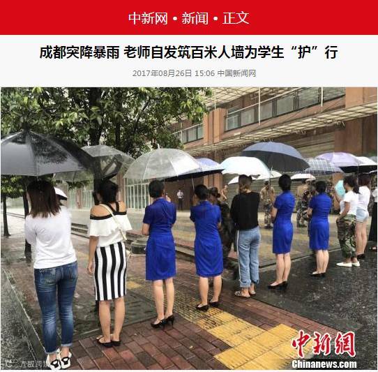 在25日的暴雨中,成都航空旅游职业学校的老师们撑着雨伞排成百米长人墙,护送学生回寝室,老师们自己都浑身湿透。