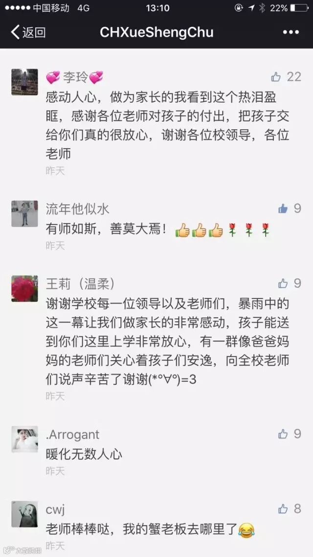 “他们都还是新生,还不会照顾自己,我们老师应该做一名‘服务员’,为学生做好服务工作。”整个护行动共持续了近一个小时,所有学生都被安全送回寝室。“最让我感动的是,一些有伞的同学还主动加入进来,一起为没有伞的同学撑伞,这让我很欣慰。”该校空乘专业部部长高维岩说道。