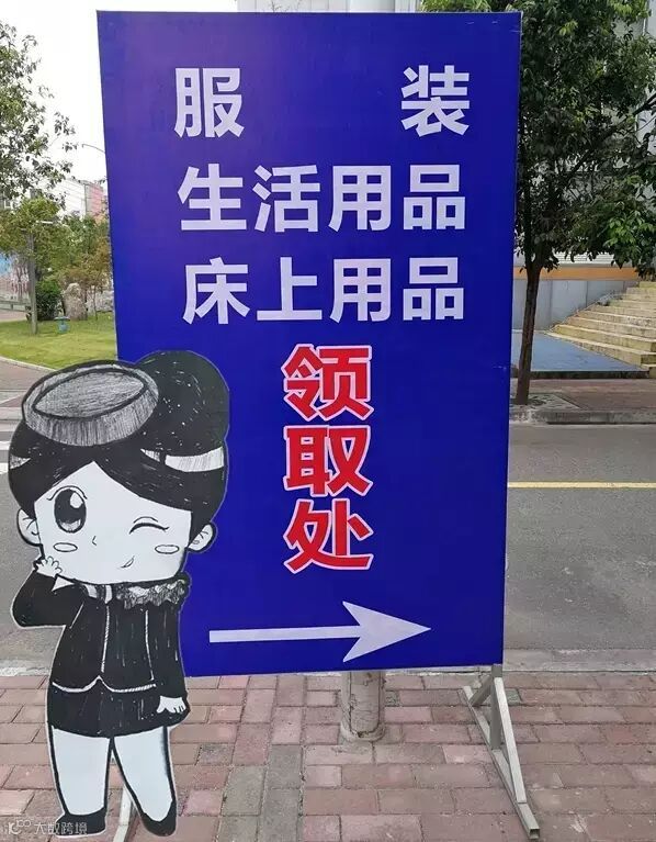 带上服装以及床上用品的发票,到第二教学楼领取帅气的迷彩服以及床上生活用品。