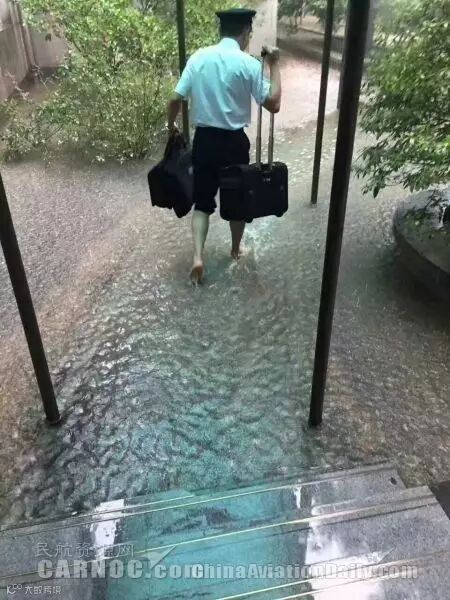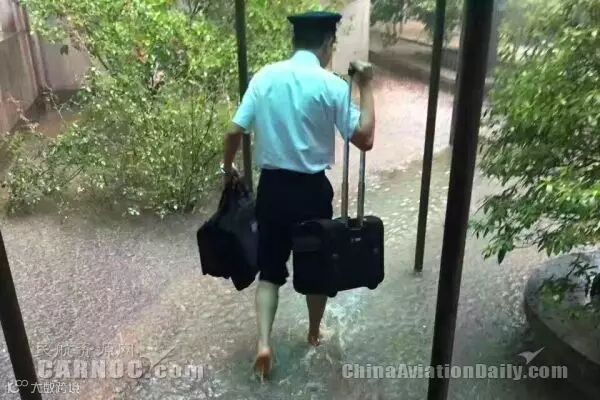 雨一直下,导致市区通往机场的收费站积了水,这可急坏了空勤人员。