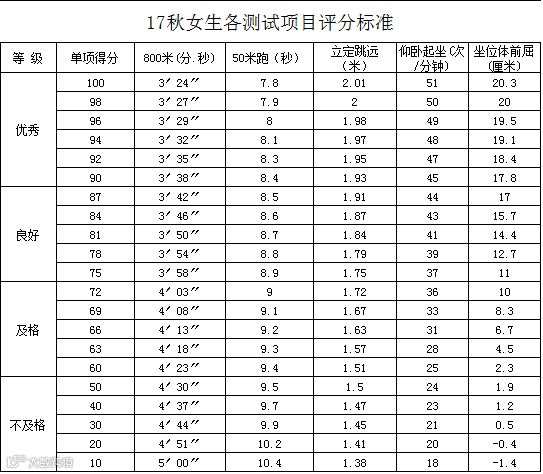 一个月的军训已经结束,为了能够清楚的掌握各位新同学的身体状况。为此将进行17级秋季新生的体能测试。