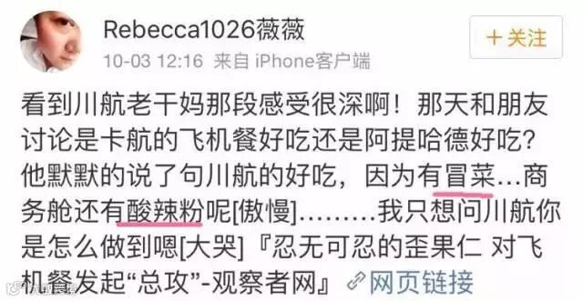 有一个网友在批评了某航空公司后,