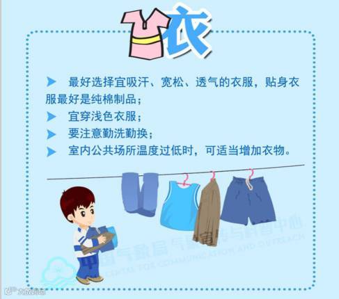 夏天,由于天气炎热,家长尽量给孩子选择吸汗、宽松、透气的衣服,同时要注意勤洗勤换。另外,当室内公共场所温度过低时,可适当给孩子增加衣物。
