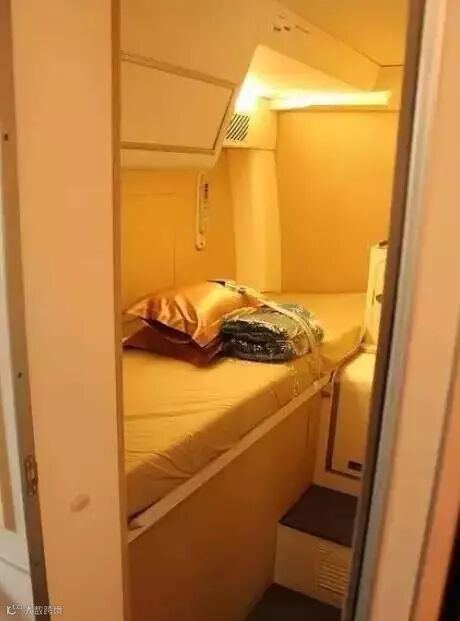 飞行员和机长的条件比空姐要好很多。在波音777上,飞行员们拥有自己的小隔间。这个小隔间里有两张床铺,两把商务舱椅,还有橱柜、卫生间、洗手盆等一应俱全。
