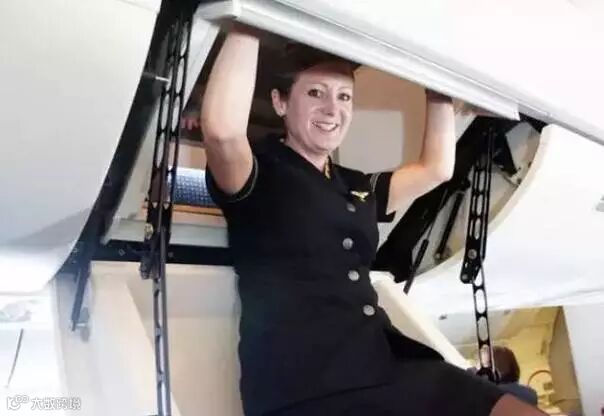 也有些乘务员是从一个看起来像行李吊挂箱的舱门进入卧室,比如图片中的这位美联航空姐,这个是波音773客机。