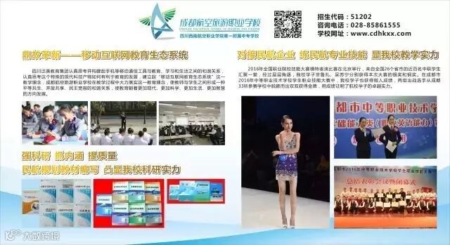 成都航空旅游职业学校是全国最大的民航中专学校,学校不仅让心怀蓝天的学子实现蓝天梦,更是在全面落实学生素质教育的基础上,培养标准的军人、培养高度职业化的民航员工、培养现代绅士与淑女,为全球航空业提供专业高端的航空人才。