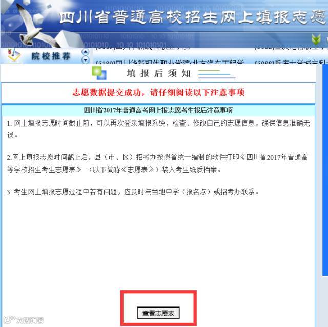 2、专科批次下设9个平行的志愿,按照从前到后的自然顺序为A、B、C、D、E、F、G、H、I。 在填报志愿时,为保障被我院成功录取,请务必在9个平行志愿中将我院作为A志愿填报。
