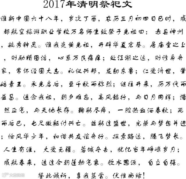 3月31日,成航校2017年清明节“祭祀祖先 缅怀先烈”仪式活动举行,上万名师生通过共同吟诵祭文,老师、学生代表分别向先祖、革命先烈、自己的祖先敬献菊花等,过了一个有意义的清明节。