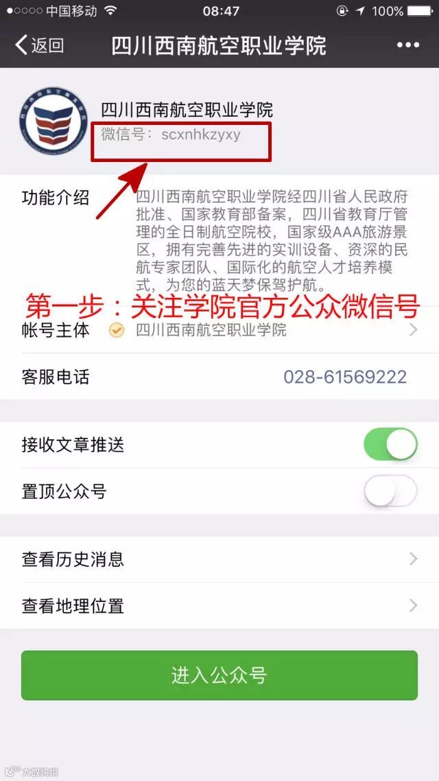 Step 1 :关注学院官方公众微信号(scxnhkzyxy)