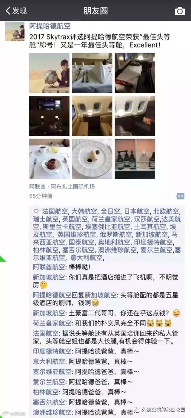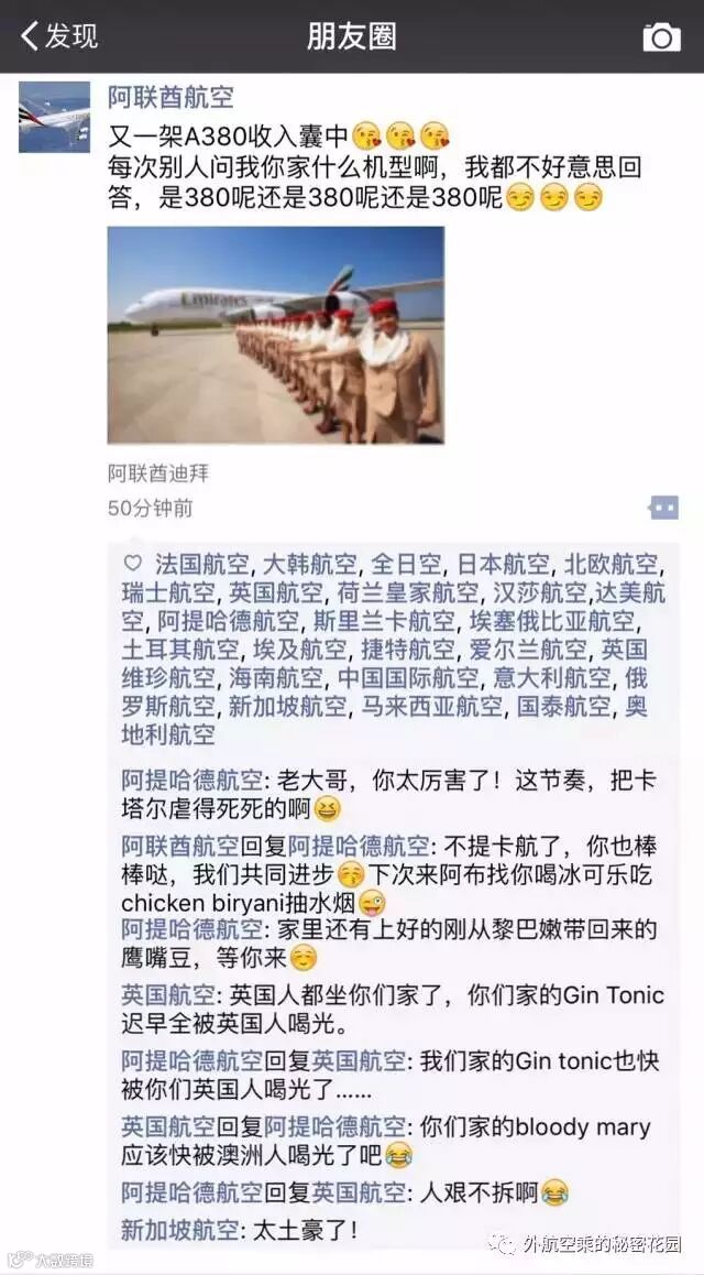 阿提哈德航空收购的意大利航空、柏林航空、塞尔维亚航空、意大利航空、爱尔兰航空、澳州维珍航空、印度捷特航空,统一的神回复“阿提哈德爸爸,真棒~”,真是让人忍俏不禁啊!
