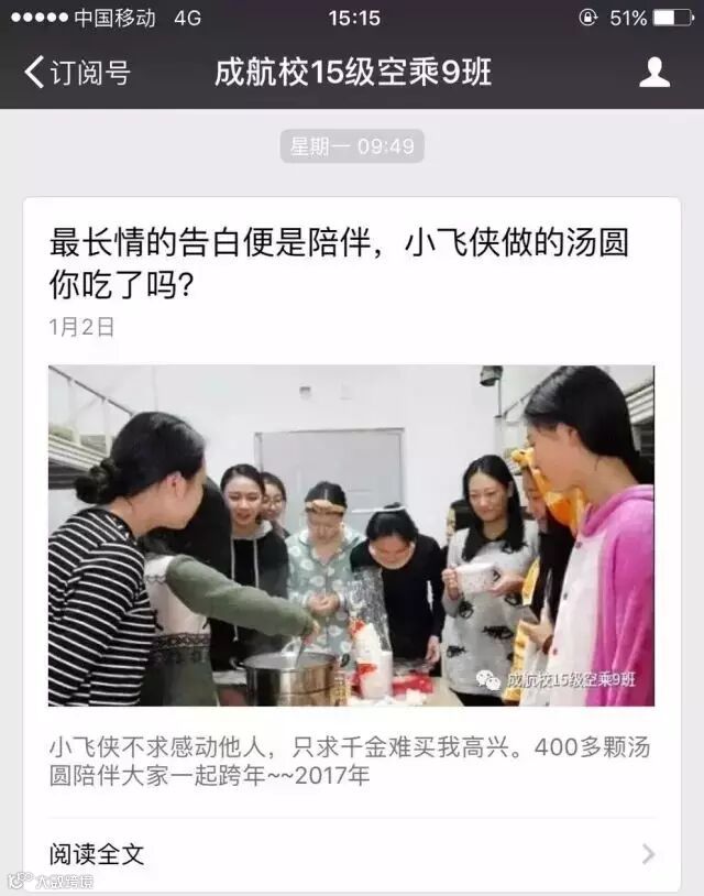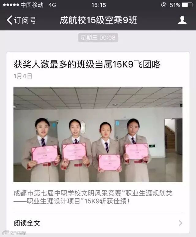 15级空乘9班是全校第一个创建班级微信公众平台的班级,通过“成航校15级空乘9班”班级公众号定期发送班级资讯,各科教育教学知识碎片以及时事、拓展知识,渗透学生素质教育,分享班级文化、特色管理、建立起良好的家校联系渠道。