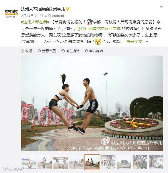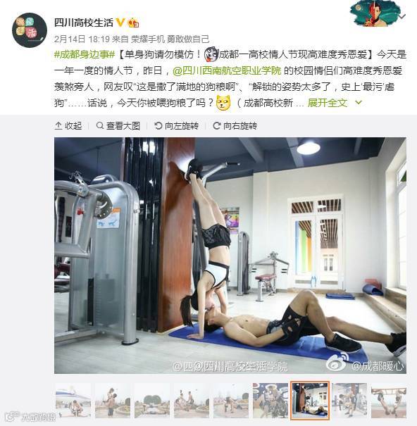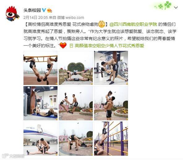 四川新闻网成都2月14日讯(记者 张进春)2月14日,每到情人节这一天,各种秀恩爱千姿百态,花样跌出,情侣、爱人们用不同的方式表达自己浪漫的爱情故事。今年情人节前夕,四川西南航空职业学院的校园情侣们高难度秀恩爱羡煞旁人,网友叹“这是撒了满地的狗粮啊”、“解锁的姿势太多了,史上‘最污’虐狗”……