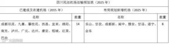 《规划》显示,截止2015年四川共有已建成及在建机场14个,到2025年四川还将新增8个民运运输机场,分别是乐山、甘孜、成都新、阆中、雅安、甘洛、遂宁及会东,届时将四川的民用机场总数将达到22个。