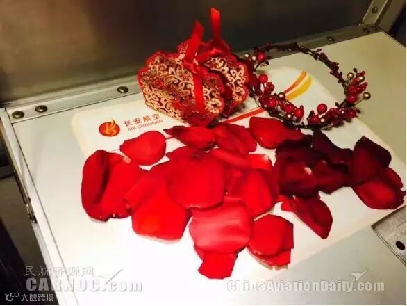 ♥ 长安航空提前准备了鲜花及喜糖,为旅客求婚保驾护航