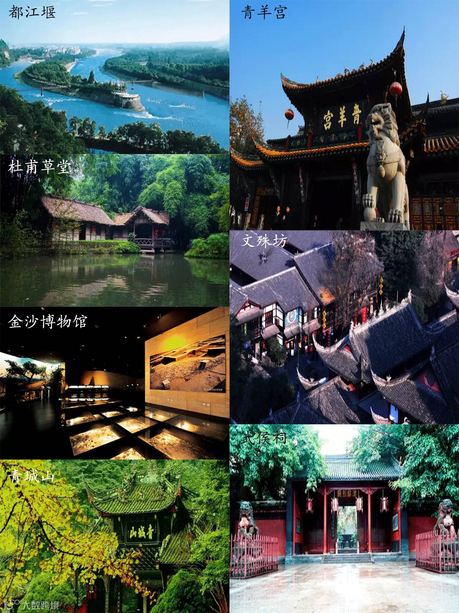武侯祠、杜甫草堂、青羊宫、文殊院、青城山、都江堰、金沙遗址...