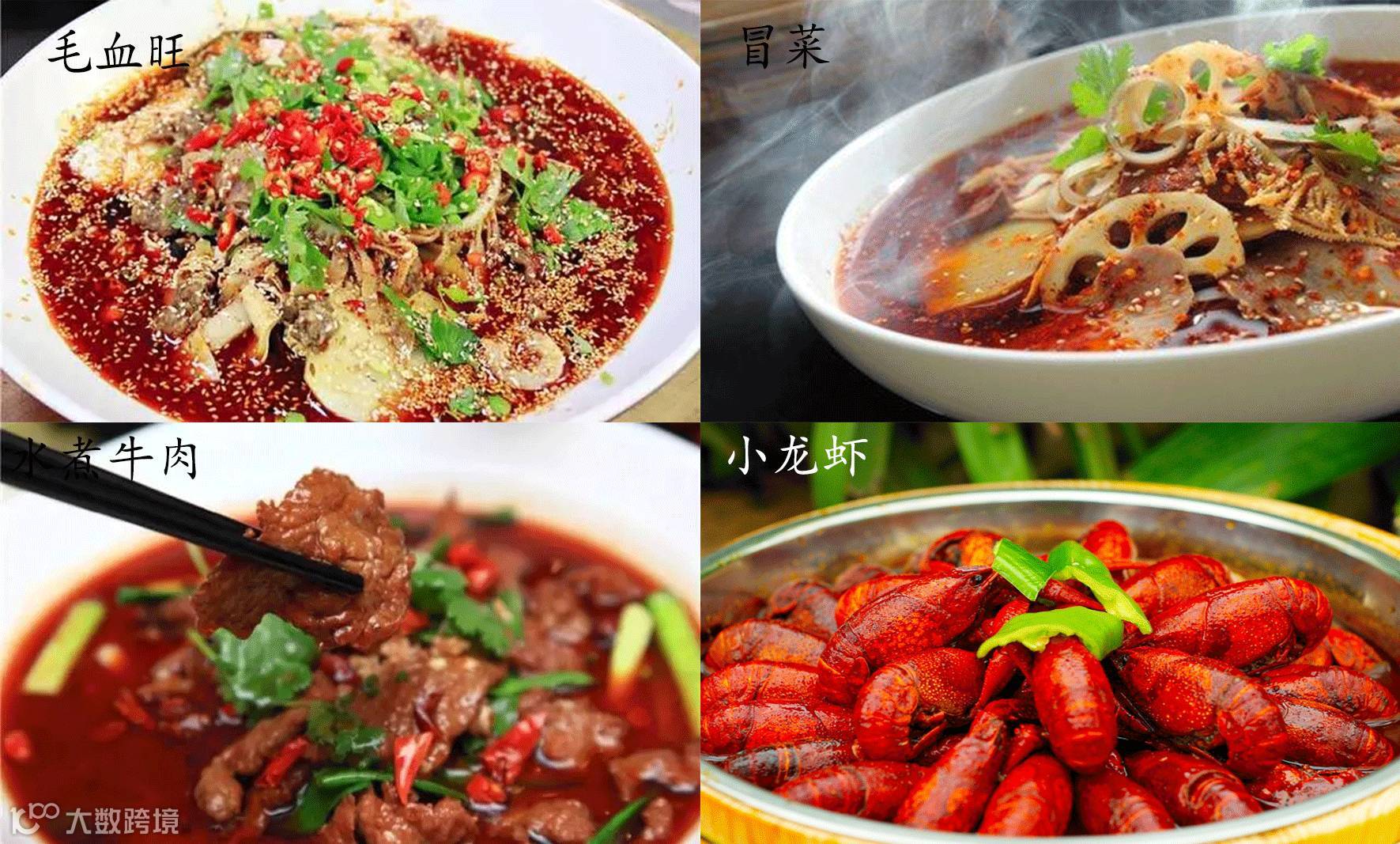 火锅、冒菜、串串香、夫妻肺片、水煮牛肉、麻婆豆腐、棒棒鸡、小龙虾、凉拌鲫鱼、毛血旺...