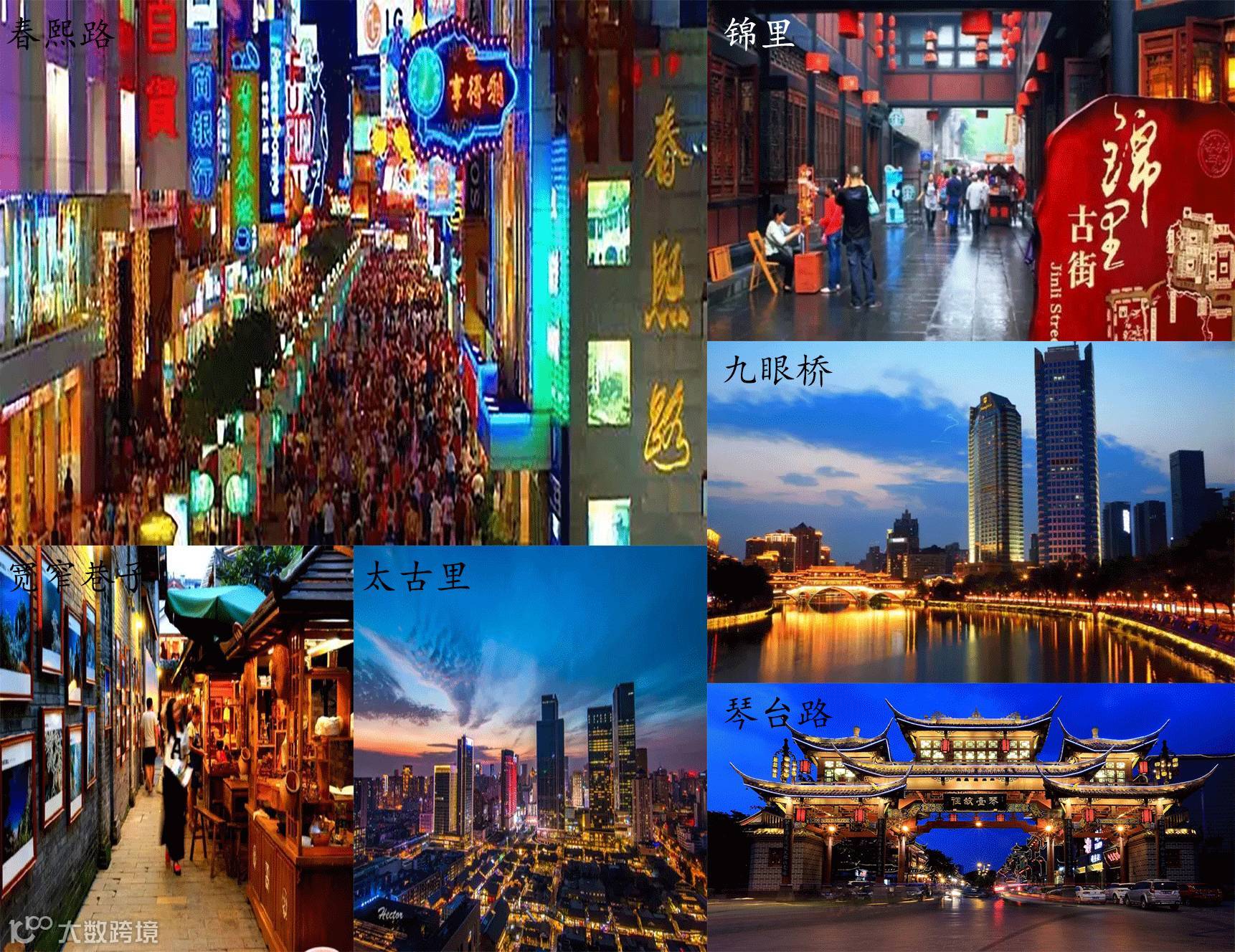 宽窄巷子、锦里、太古里、春熙路、琴台路、九眼桥...