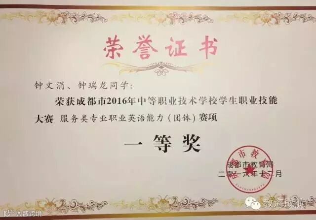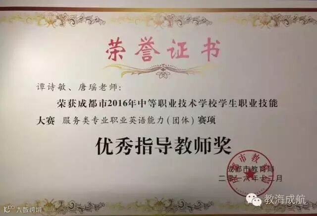 成都市2016年中等职业技术学校学生职业技能大赛总结表彰会议暨闭幕式隆重举行!成航校获得傲人成绩!两组出战选手从成都33所参赛学校中脱颖而出双双获金,两组的指导老师也纷纷获得优秀指导老师奖,成航校更是获得了优秀组织奖的荣誉!