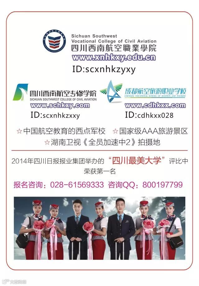 成都泛美航空旅游职业学校是经成都市教育局批准成立,与四川西南航空职业学院同属四川泛美教育集团,是西南航院附属中专。专门从事民航空中乘务、民航空中安全保卫、民航安全技术管理、飞机维修、无人机操作与维护等专业人才培养的全日制中等专业学校。