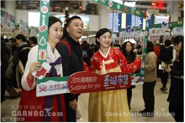 12月22日下午,海南航空12国乘务员化身市集摊主,带领旅客来到充满异国风土人情的摊位参与互动活动,领略各国圣诞风情。