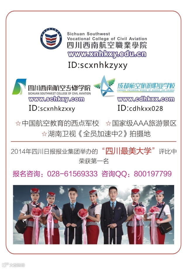 四川西南航空职业学院是经四川省人民政府批准,国家教育部备案,直属四川省教育厅管理的全日制航空高职院校,拥有中国先进的航空专业实训设备、一流的民航专家团队和创新完善的航空人才培养模式,向社会输送了大量的专业人才,毕业生就业率保持在96%以上,其中民航对口就业率超过90%。