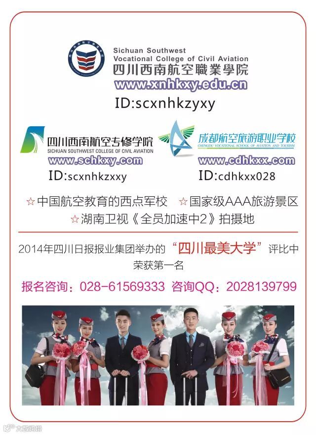 成都泛美航空旅游职业学校是经成都市教育局批准成立,与四川西南航空职业学院同属四川泛美教育集团,是西南航院附属中专。专门从事民航空中乘务、民航空中安全保卫、民航安全技术管理、飞机维修、无人机操作与维护等专业人才培养的全日制中等专业学校。