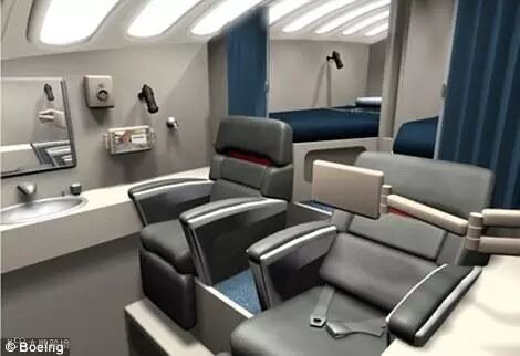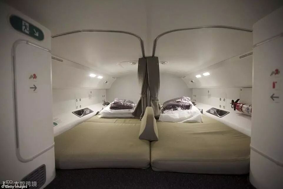 波音777为飞行员单独准备了一个空间,里面有两张床,两个商务舱座位,部分飞机里还有一个洗手台。