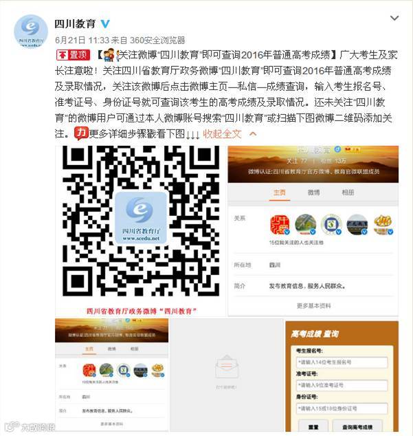 考生可关注新浪微博@四川教育,点击菜单“私信”,通过对话框下方自定义菜单进入到相应的查询页面,免费查询高考成绩和录取情况。