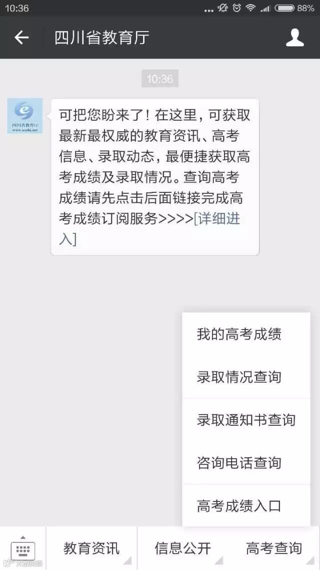 考生可关注微信公众号四川省教育考试院或微信公众号四川省教育厅,免费查询高考成绩和录取信息。