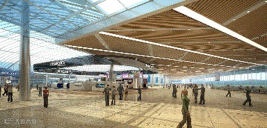 进入值机大厅,通过旅客安检/联检区。航站楼内部恢弘大气,布局清爽,体现了强烈的未来感和科幻感。