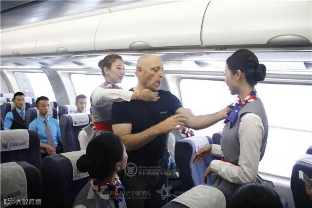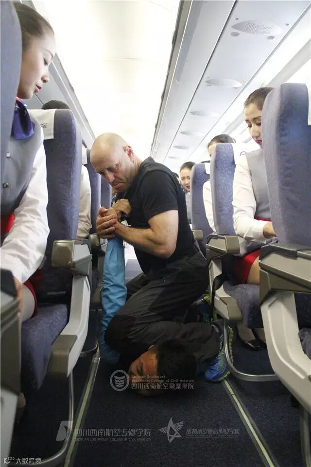 双手紧握,手腕顺着对方手肘方向用力一压,脚踩高跟的优雅空姐轻松放倒高出她半个头的成年男性,这是发生在现场的真实一幕。