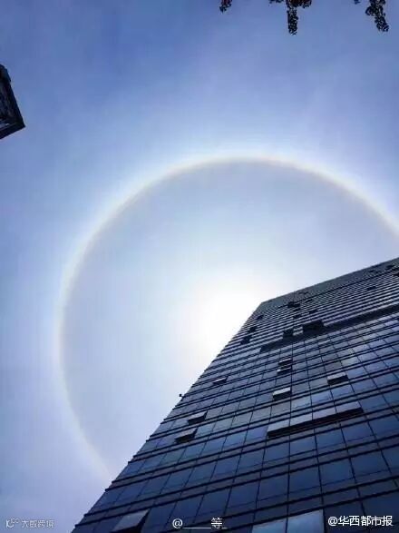 天晴了。上午10点,成都的太阳还没有冲破云层,就戴着“草帽”出现了。这像太阳的项链的七彩光晕,叫做日晕,是太阳光通过云层中的冰晶时,经折射或者发射形成的一种光学现象。一般都是围绕太阳呈环形或弧形,有红、橙、黄、绿、蓝、靛、紫七种颜色。出现日晕往往预示着天气将会有变化,民间也有“日晕三更雨,月晕午时风”的谚语。日晕看起来像眼睛、像飞碟……太阳也玩cosplay呀!