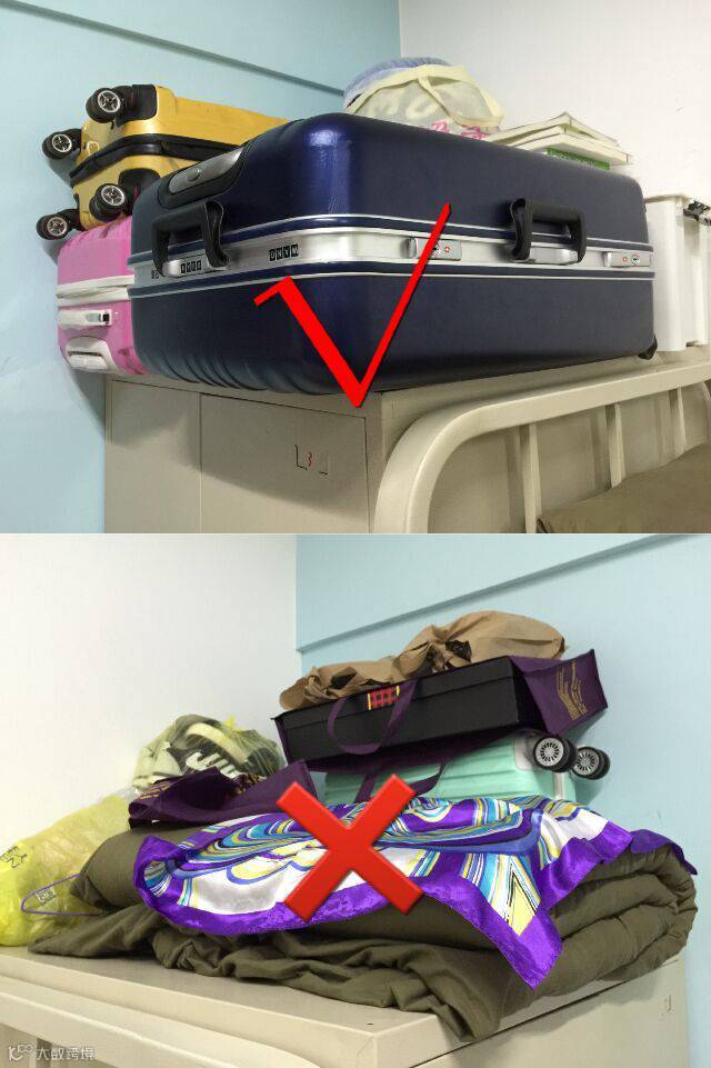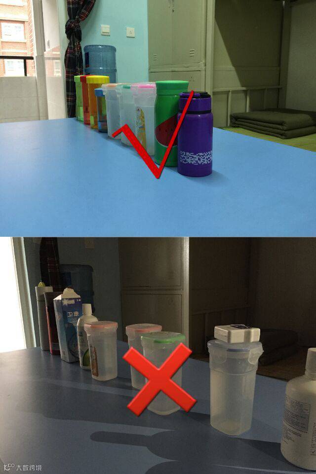 寝室柜上物品的摆放整齐一眼望去清晰而明亮,不整齐则像一盘散沙。
