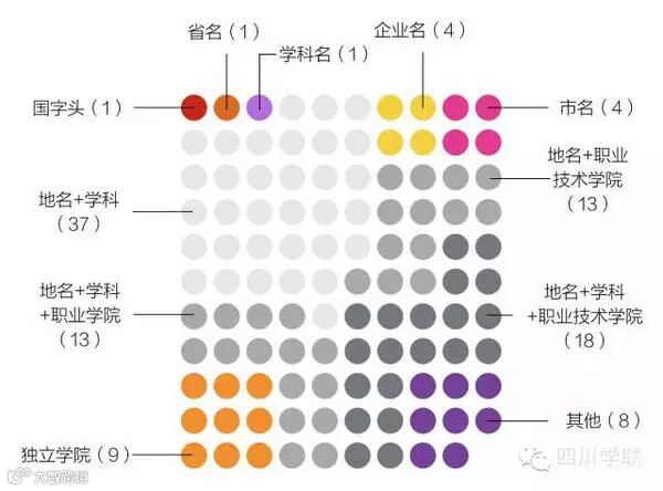 亲们先看看上图,这是小莲归纳的全省高校命名的11种构成方式。数量前四名分别为:“地名+学科+大学/学院”、“地名+学科+职业技术学院”、“地名+学科+职业学院”、“地名+职业技术学院”,用以上四种方式命名的高校共计有82所,占到了总数的75%。