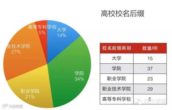 在109所高校中,有15所为“大学”,89所为“学院”,其中23所为“职业学院”结尾,29所为“职业技术学院”结尾,还有5所以“高等专科学校”结尾,分别为成都纺织高等专科学校、四川中医药高等专科学校、四川幼儿师范高等专科学校、川北幼儿师范高等专科学校、川南幼儿师范高等专科学校