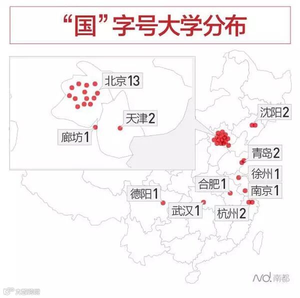 在全国,"国"字号大学共计26所,"央"字号大学共计6所,有13所位于北京。不过,未来“国”字号“央”字号的大学极有可能不再增加,教育部于2006年印发的《普通本科学校设置暂行规定》规定:校名不冠以“中国”、“中华”、“国家”等字样。自2004年北京广播学院更名中国传媒大学之后,我国再也没有新增一所“国”字号大学。