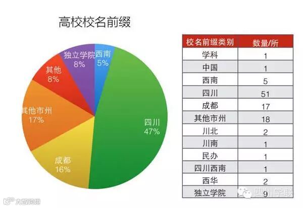 地名开头的学校中,5所为“西南”,51所为“四川”,17所为“成都”(不含独立学院,如西南交大希望学院不计入“西南“),最霸气的是四川西南航空职业学院,同时占了西南和四川两个地名有木有!