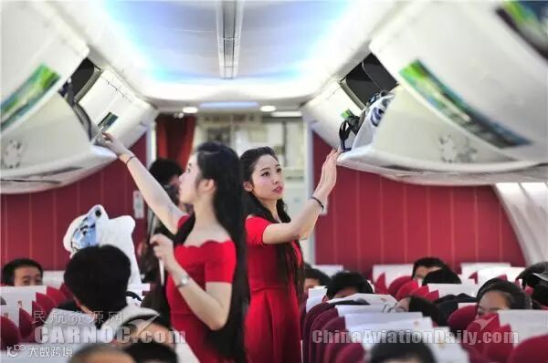 图:身着中国红礼服的空乘人员
